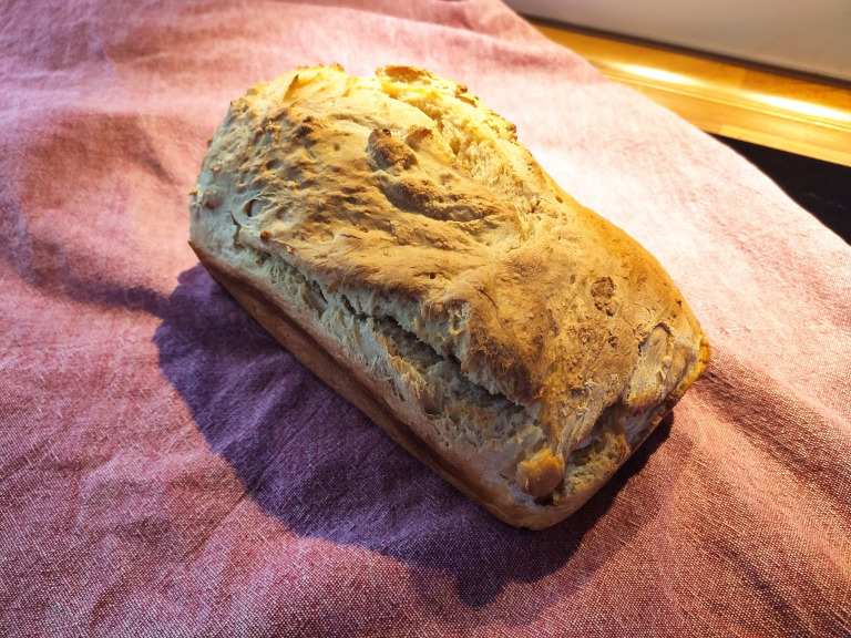 Dejen æltes godt igennem og stilles til hævning et lunt sted i 35 min, derefter slåes dejen ned, formes til et brød og efterhæver i 20 min.