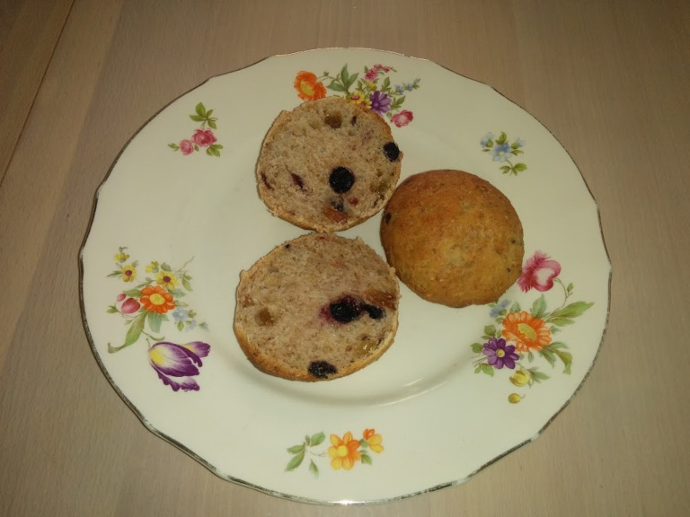 Tranebær, rosiner, blåbær og kirsebær overhældes med kogende vand, og lad trække i 20 min., før man dræner vandet fra. Jeg lader dem trække hver for sig, for ikke at de afgiver farve til hinanden.