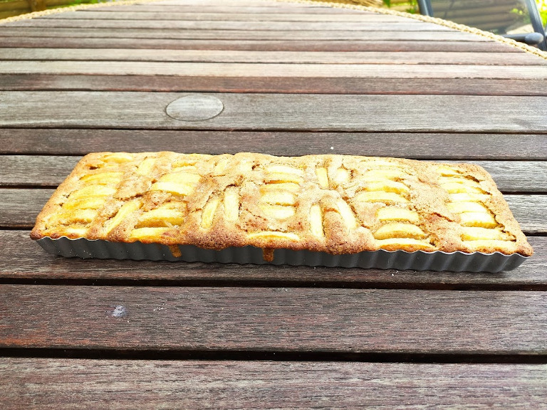 Æblerne drænes og placeres på dejen (her mulighed for at lave mønster på kagen) og drys kagen med kanelsukkeret.