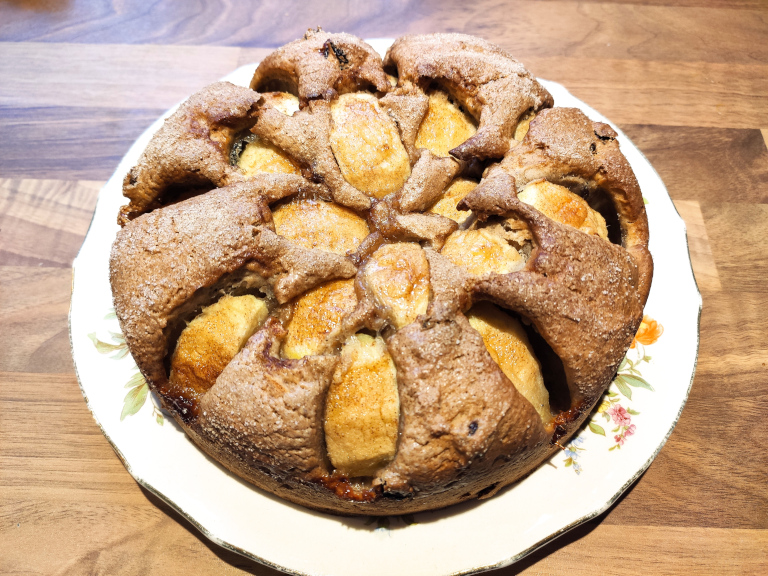 Dejen bredes ud i et ildfast fad, der er smurt med smør eller lignende. Æblebådene stikkes ned i dejen og kanelsukker drysses over.