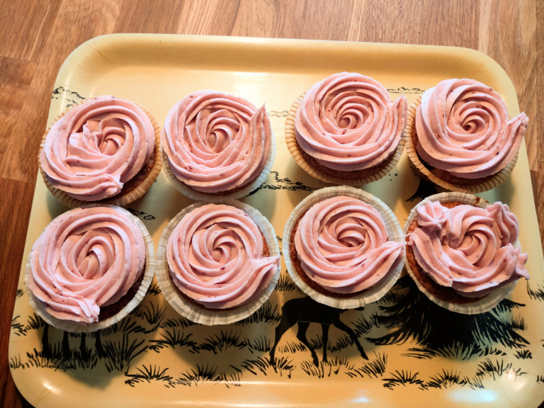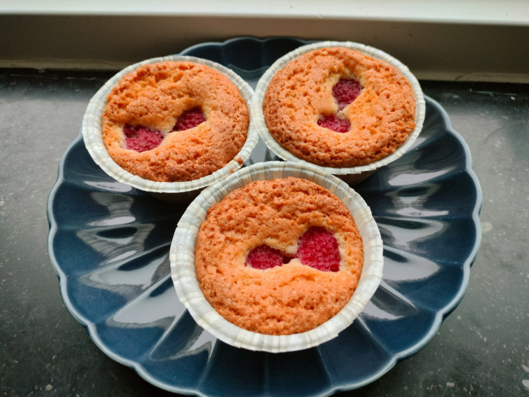 Bærene fordeles ovenpå dejen - trykkes let ned. 2 spsk. vaniljesukker fordeles øverst på kagerne.
