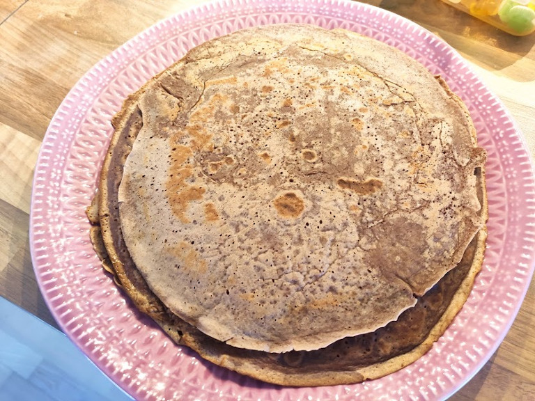 Ingredienserne piskes godt sammen og de 2 pandekager bages i en anelse smør på en varm stegepande.