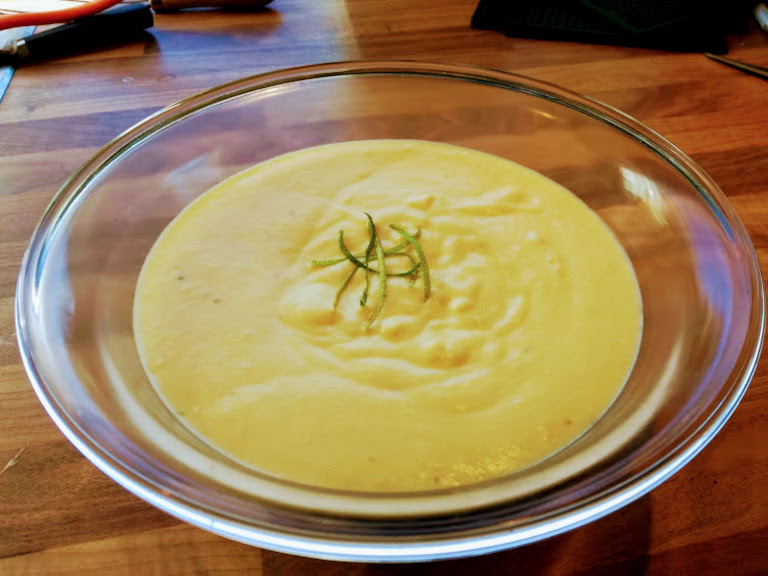 Mangoen skrælles, stenen fjernes og frugten blendes med limeskal (man kan evt gemme lidt til at pynte med).