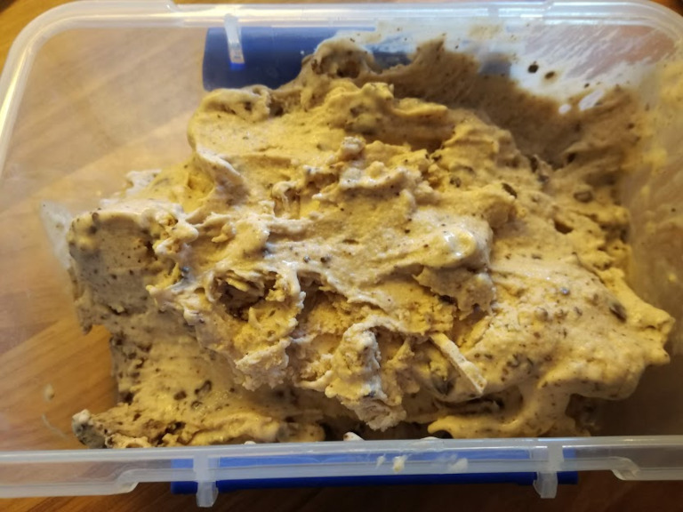 Bananblandingen, flødeskum og chokolade vendes forsigtigt sammen.