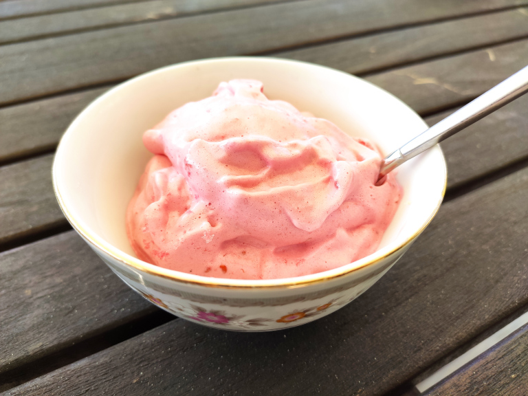 Bærblandingen og æggehviderne vendes forsigtigt sammen, indtil massen er let og luftig.