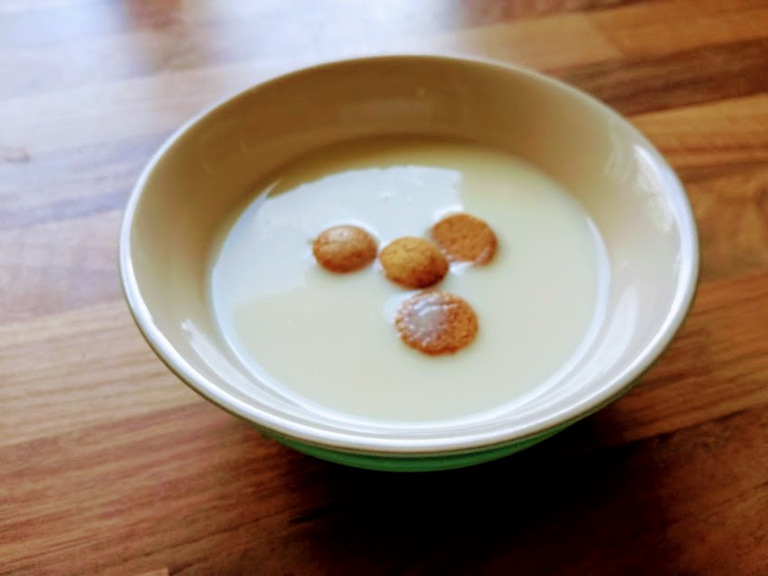 Æg, sukker, vanilje og juice piskes godt sammen, derefter piskes mælken i.