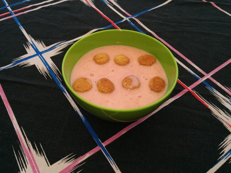 Æg, sukker, vanilje og citron piskes godt sammen, derefter piskes jordbær og mælken i.