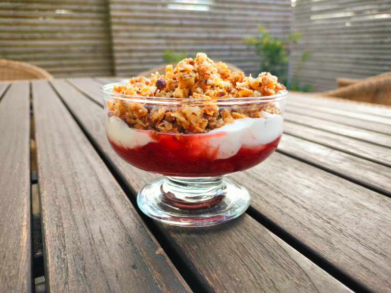 Triflien samles ved at man anretter skiftevis med kompot, crumble og råcreme.