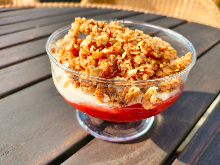 Triflien samles ved at man anretter skiftevis med kompot, crumble og råcreme.