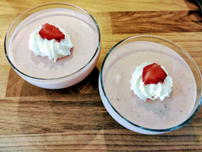 Rørsukker og æggeblomme pisket skummende og jordbærmos piskes i.