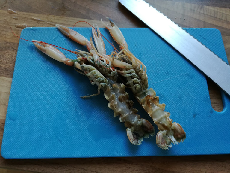 Læg jomfruhummerne på ryggen på et hårdt underlag og flad halen helt ud. Jeg foretrækker at anvende en brødkniv, da man så kan dele hummeren ved at save igennem med et let tryk - ellers ødelægger man nemt hummeren.