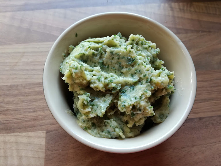 120 g smør, blødgjort 1-2 fed hvidløg, presset 1 tsk. citronsaft ½ tsk. citronskal, zested eller revet 1-1½ tsk. sennep 1 håndfuld frisk persille, hakket smag til med salt og peber
