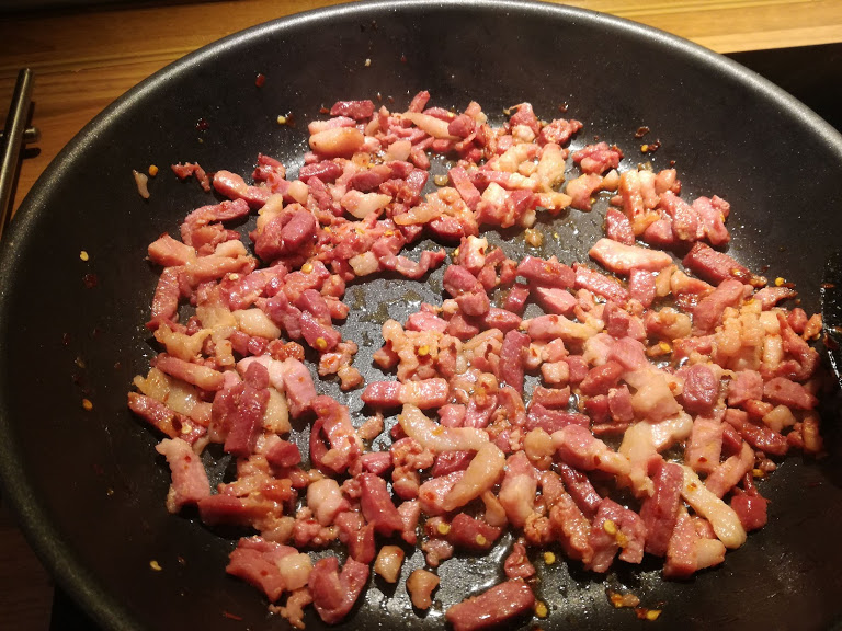 Olivenolien varmes op på en stegepande og chilien svitses heri. Bacon tilsættes og steges indtil den ønskede sprødhed er nået.