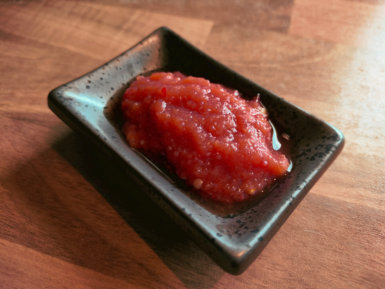 3 røde chilier, uden kerner 1 fed hvidløg 1 spsk. Muscovadosukker, mørk 1 dåse hakkede tomater 1 æble, rødt og sødt gerne Royal Gala el. lign.