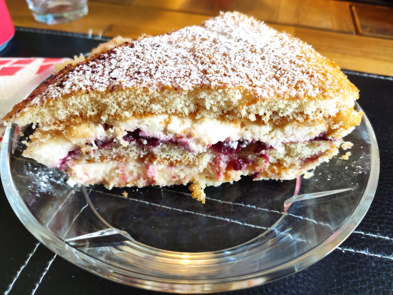 Har anvendt den i lagkage sammen med æblemarmelade med kanel 1 æble skåret ud tyndt på et mandolinjern (lagt i citronvand for at udskyde oxideringen lidt) og lidt boysenbærmarmelade - se billedet.