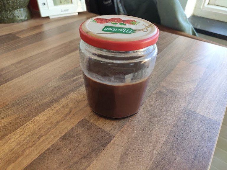 Opbevar chokoladen i glas ? det skal ikke stå i køleskabet, altså hvis man gerne vil kunne smøre det på, for det bliver pænt hårdt.