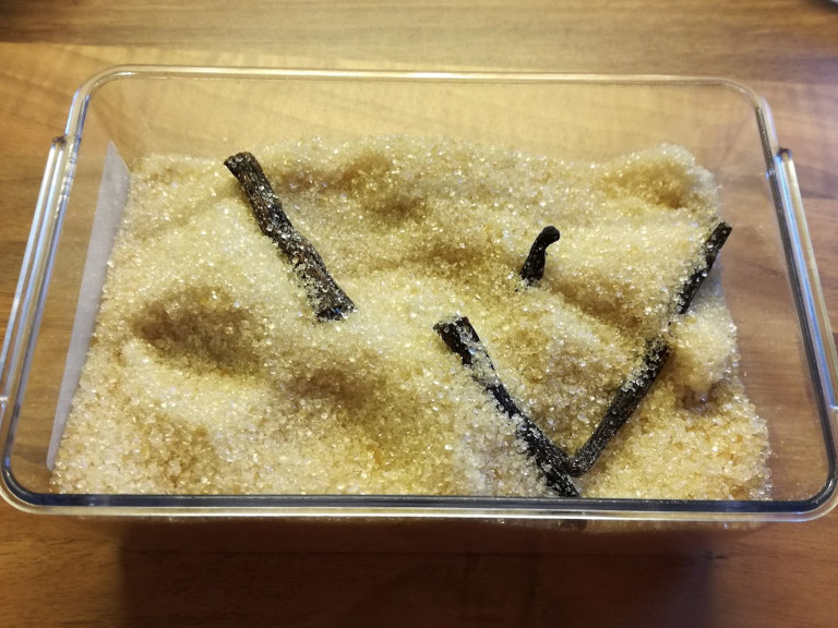 Vaniljestængerne deles, kornene tages ud og hældes i sukkeret.