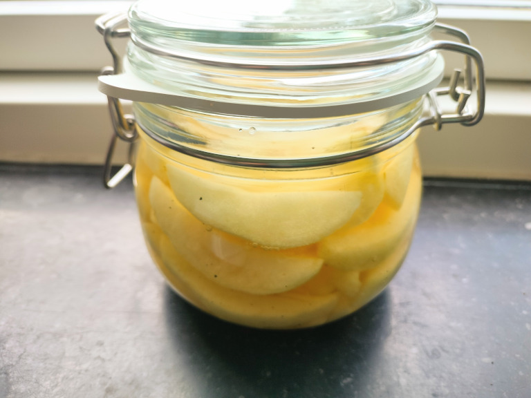 Æblebådene hældes i den kogende sukkerlage og lad simre i 3-4 min.