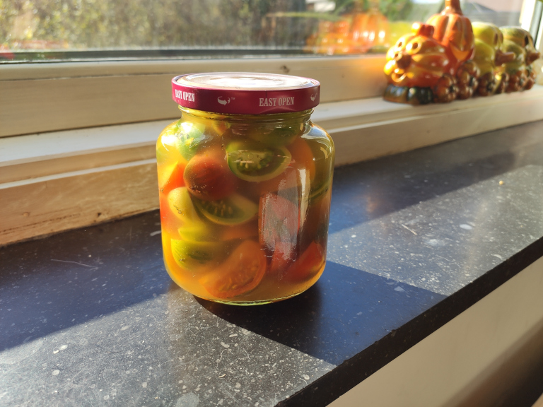 Laves af små tomater gerne i blandede farver. Har anvendt de umodne tomater der ikke når at blive modne, da efteråret ikke byder på nok sol og varme.