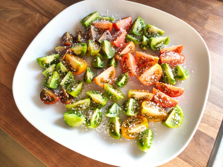 Salt fordeles over tomaterne, der stilles koldt i 3 timer.