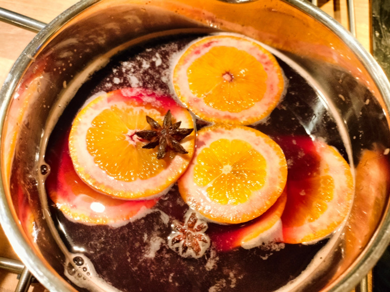 1 flaske rødvin100 g rørsukker1½ dl appelsinjuice2 nelliker2 stjerneanis1 kanelstang ((3-5 cm)1 appelsin, skåret i skiver