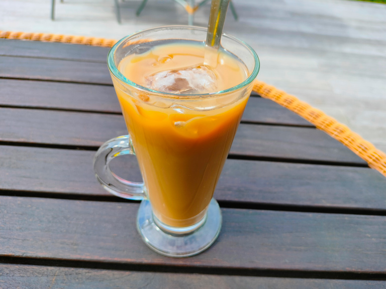 Sukkeret opløses i kaffen. Tilsæt isterninger og mælk.