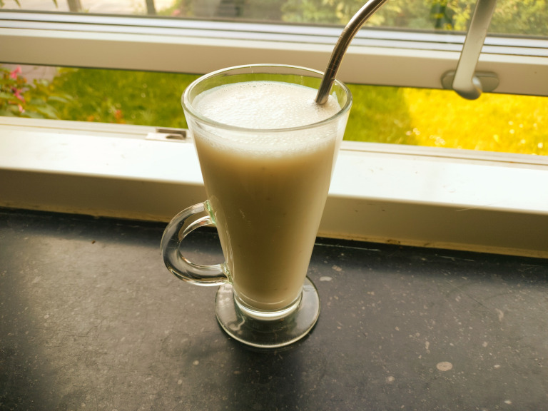 Alle ingredienserne blendes godt sammen og serveres med det samme.