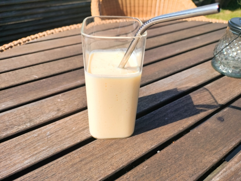 4 prs.250 g mango, frosne tern½ dl limesaft1 liter yoghurt naturel4 spsk. sukkerAlle ingredienserne blendes godt sammen og serveres med det samme.