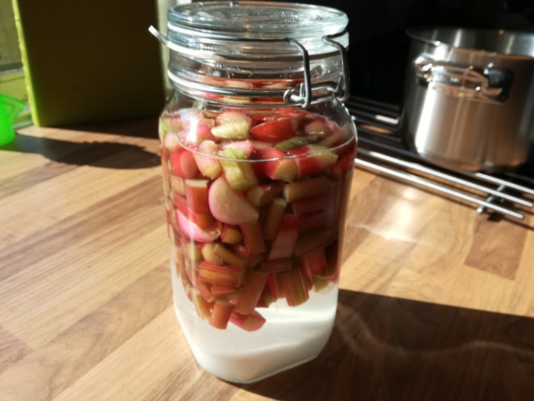 Rabarber, sukker og vodka hældes i glasset, der stilles til side i 6 måneder.