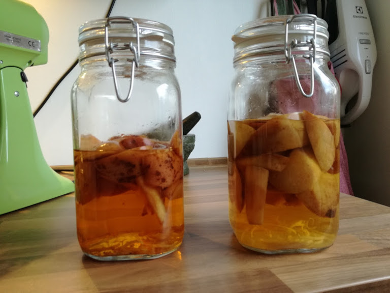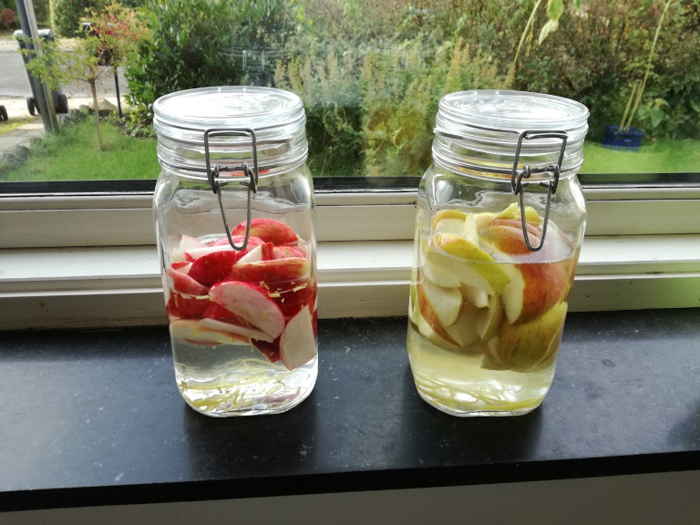 Jeg afprøver 2 af de æblesorter, der vokser i min have - så kan jeg også se hvad der sker med farven og smagen alt efter sort.