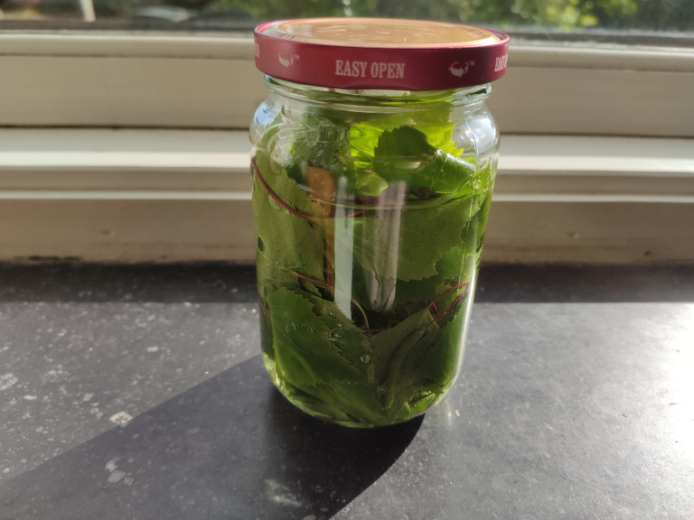 Fyld et glas halvt op med friske blade og/eller ranker. Hæld vodka over og lad trække 14 dage. Snapsen drænes og hældes på flaske - lad hvile i 14 dage før den serveres.