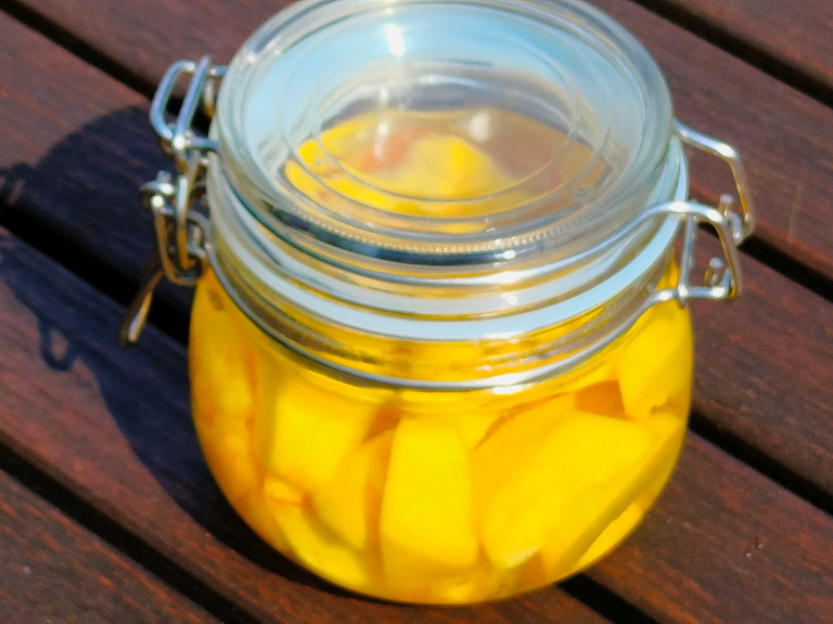 Fersknerne skæres ud i både - stenene og skin skal fjernes - og placeres i et glas, en flaske eller anden egnet beholder.
