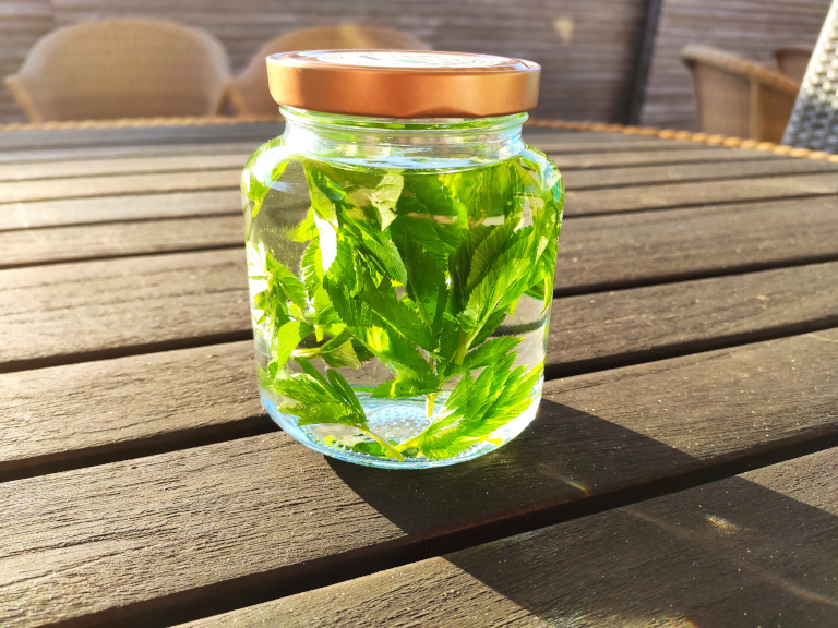 Skvalderkålen skyldes og placeres i et glas, en flaske eller anden egnet beholder.