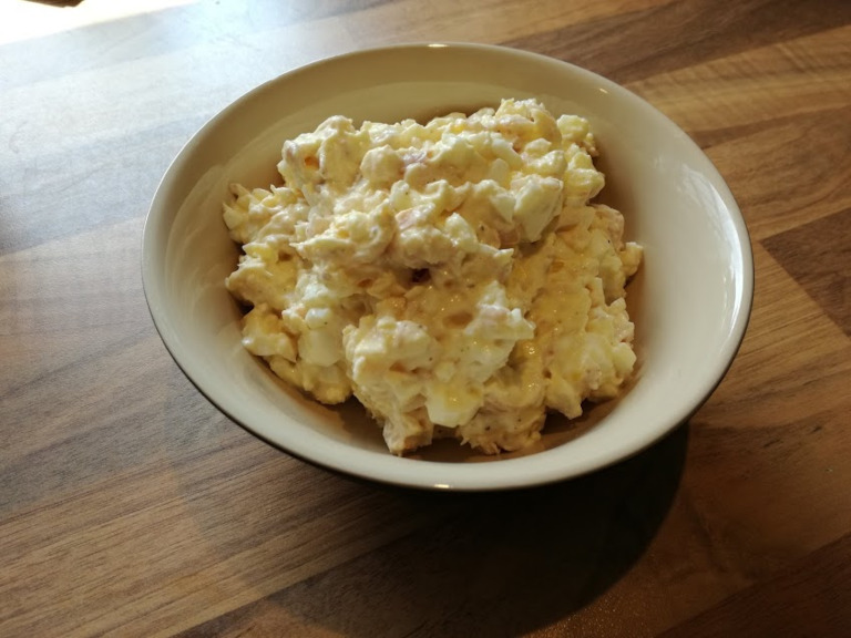 Fisk og æg hakkes i mindre stykker - ved håndkraft. Hvis salaten hakkes for voldsomt kan den blive flydende.