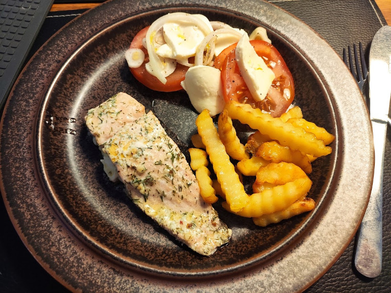Laksebøfferne anrettes i et ildfast fad, smørret fordeles på bøfferne og til sidst krydres med friskkværnet peber.