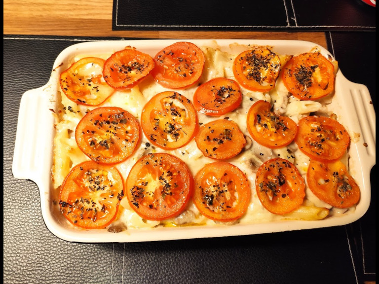 Blandingen hældes i et smurt ildfast fad og parmesan osten drysses over. Tomatskiverne anrettes ovenpå, pensles med olie og drysses let med oregano.