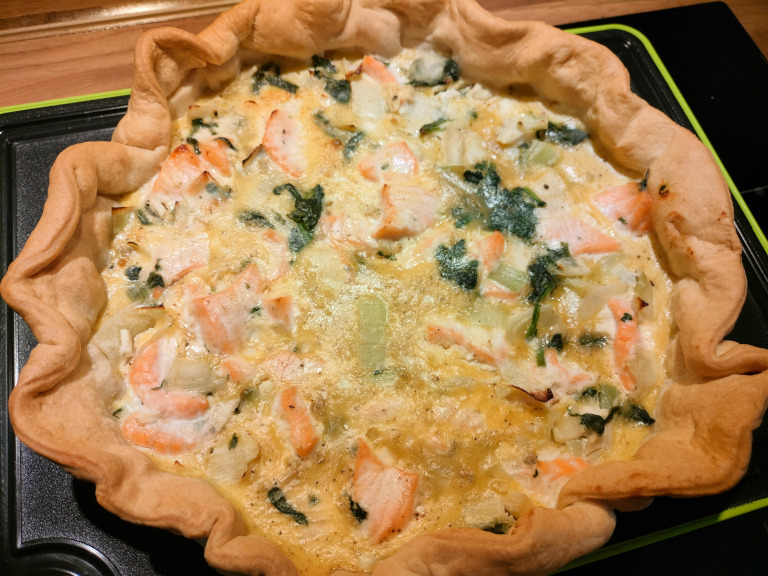 Bland spinatblandingen, laks, porrer, ost, peber og salt sammen og fordel blandingen på den forbagte bund.
