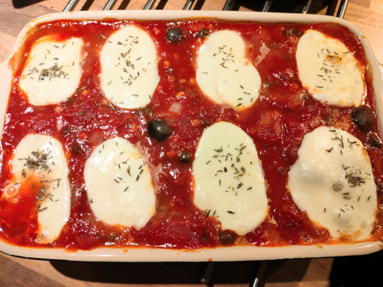 Overfør 3-4 spsk af saucen til et ildfast fad, placer fiskestykkerne ovenpå og hæld resten af saucen over fisken.