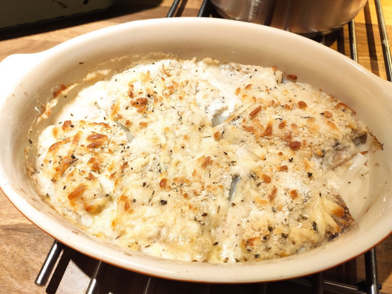 Rasp, basilikum og ost blandes godt sammen og drysses oven på fisken.