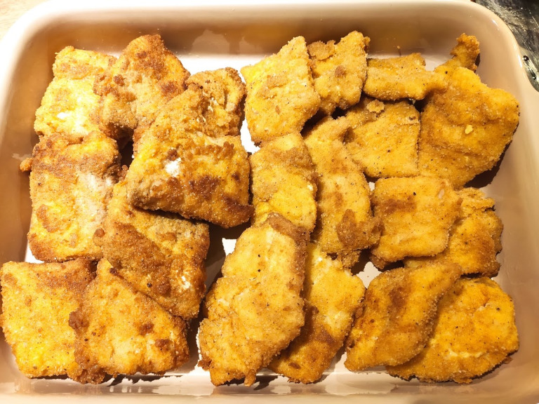 Olien varmes op i en pande, og fiskestykkerne steges sprøde og gyldne heri - sørg for at de ikke rører hinanden, når de føres over i panden, for at undgå at de klistrer sammen.