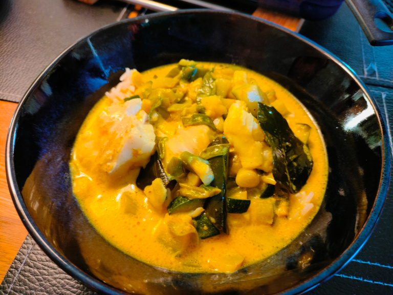Serveres med kogte ris og evt. rejechips og/eller cashewnødder.