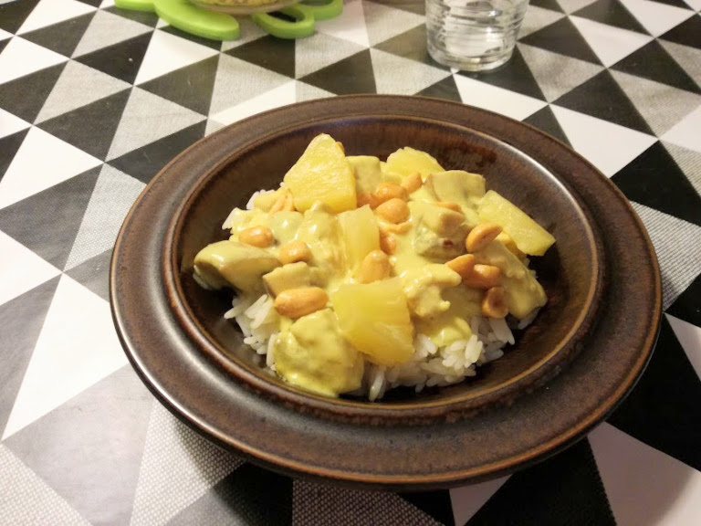 Serveres med ris og ananasstykker og med peanuts drysset over i rigelige mængder.