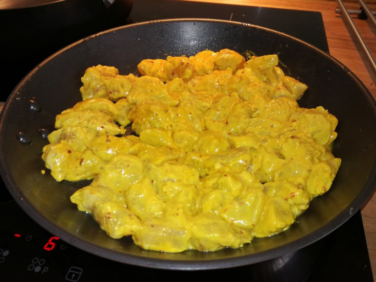 Kylling og marinaden hældes over i en pande og steges indtil kødet er mørt - stil til side.