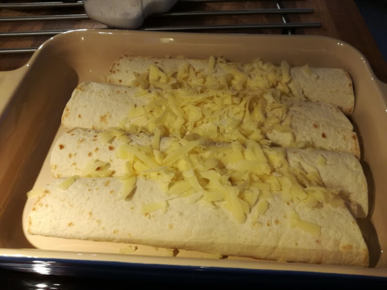 Pandekagerne fyldes med kødet, 2 tsk. cremé fraîche hver og lidt cheddarost. Rulles sammen og lægges på samlingen i et smurt ildfast fad.