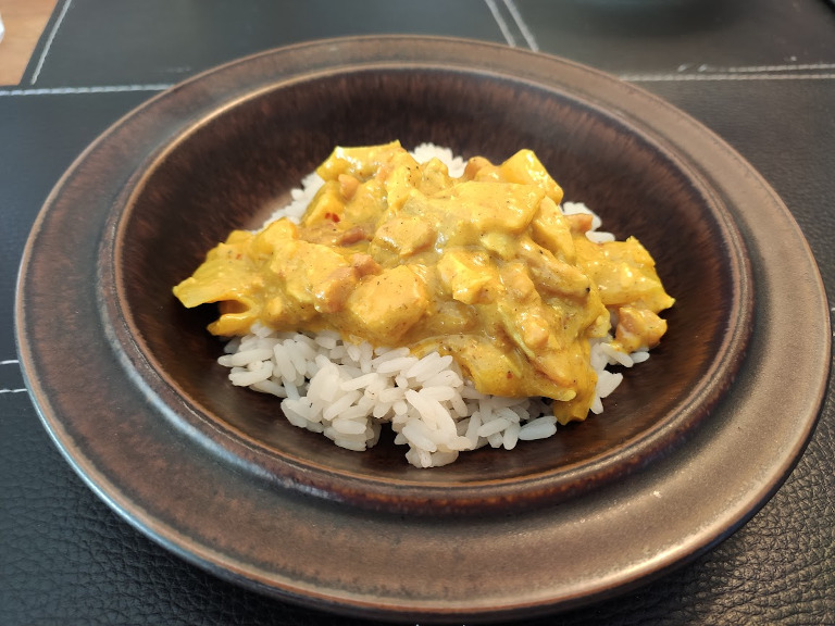 Kyllingekødet anrettes i et ildfast fad, karrysaucen hældes ved og retten steger i ovn ved 200° i 1½ time.
