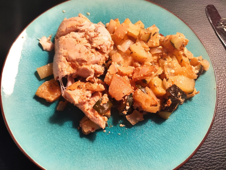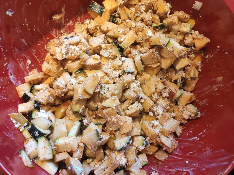 Grøntsagsternene vendes godt sammen med feta og krydderierne, hvorefter blandingen placeres oven på kyllingekødet ? dækkes til igen og ovn bages i 1 time.
