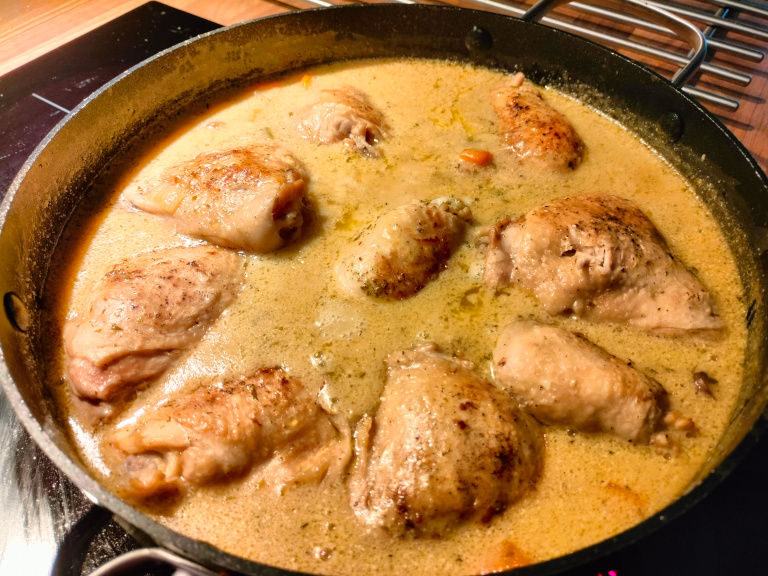 Kyllingekødet lægges tilbage i panden, låg lægges på og lad simre i ca. 40 min.
