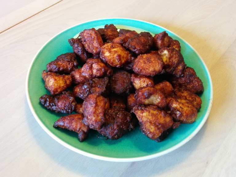 Olien varmes godt op - ja den skal være pænt varm. Kyllingestykkerne lægges forsigtigt ned i gryden - de skal helst ikke røre hinanden, da de så vil "vokse sammen" til større stykker. Min erfaring er at 3½ minut er nok - men man kan jo pøve med 1 stykke først og tage tid, da sådanne udregninger afhænger af kødstykkernes størrelse.