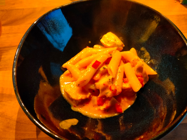 Tilsæt pastavand og når saucen koger tilsættes peberfrugt og hakkede tomater. Lad simre i 4-5 min.