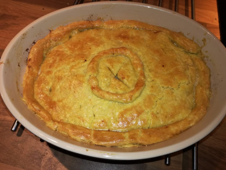 Et ildfast fad med høje kanter smøres med smør/olie og fyldet fordeles i fadet.